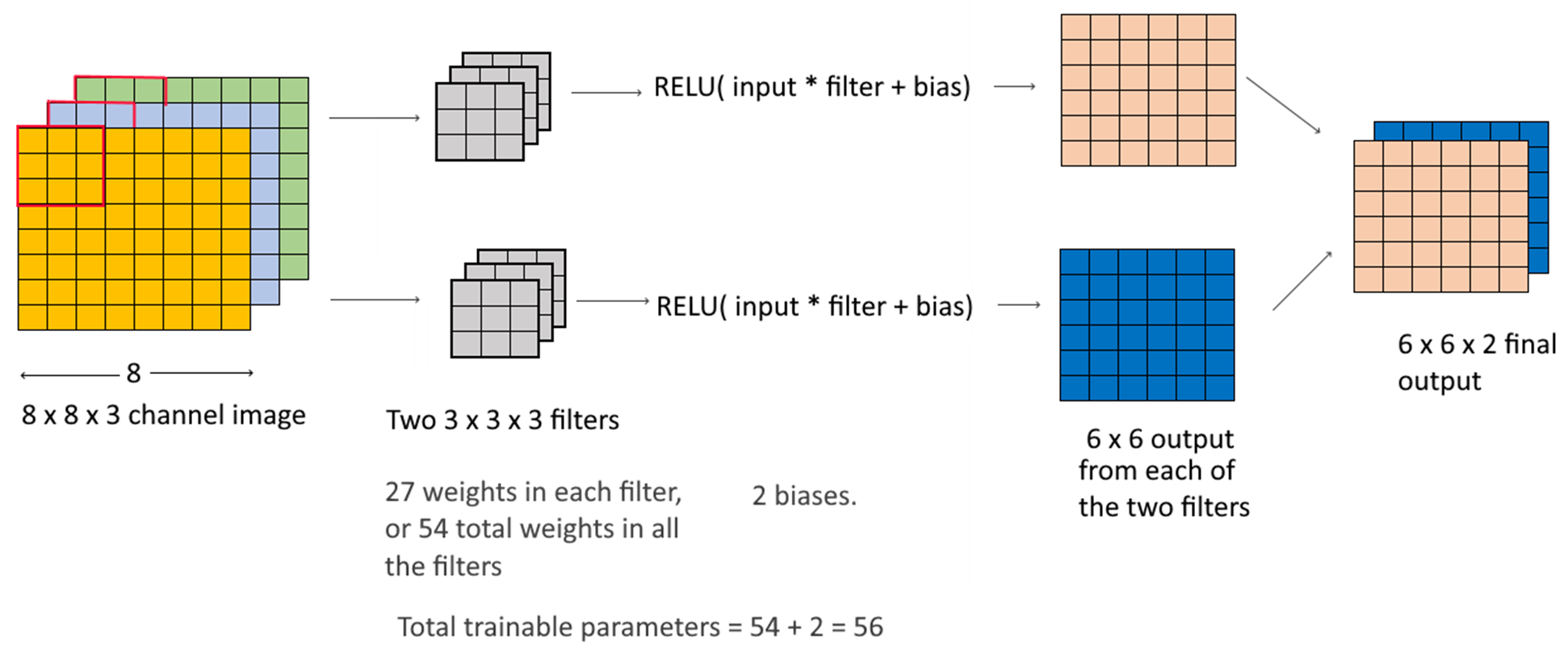Consider a 3 x 3 filter applied to a 3-channel 8 x 8 image: